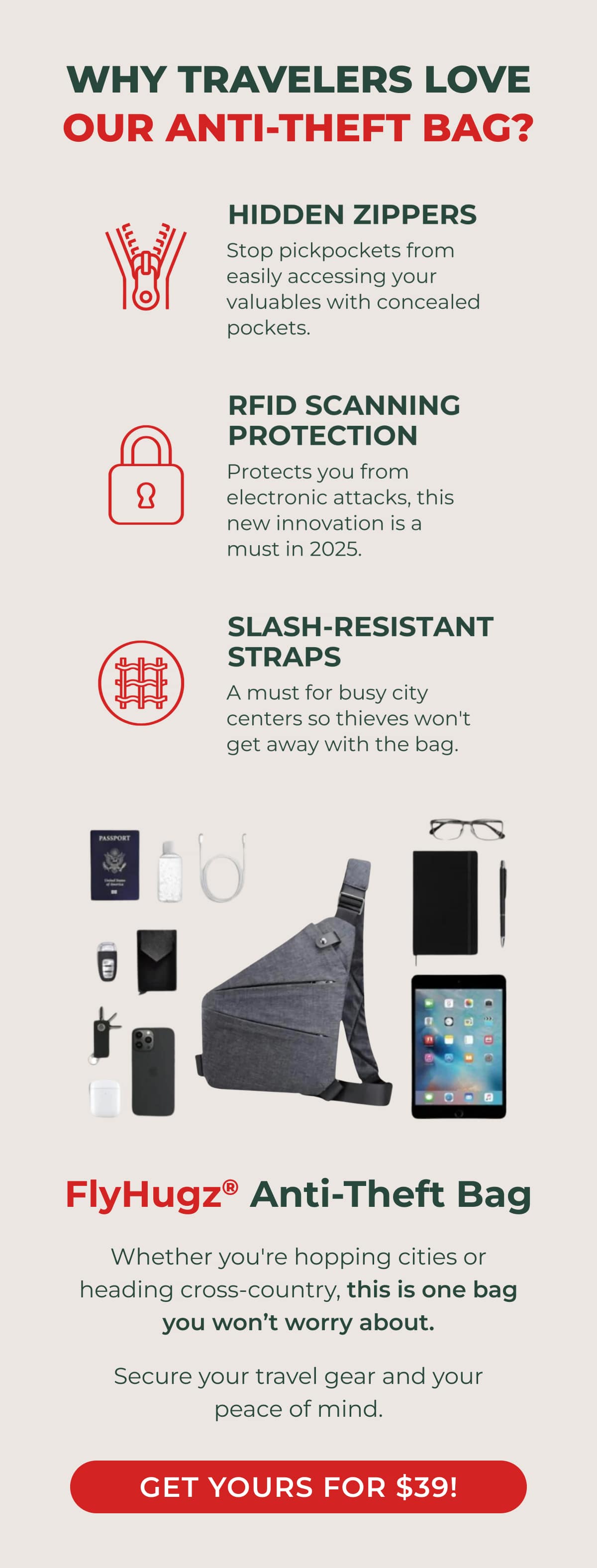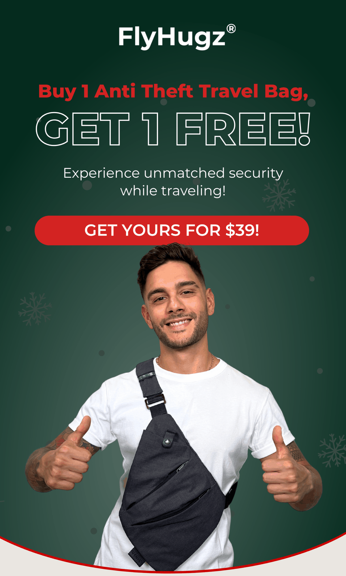 Our mission: At FlyHugz®, our mission is to elevate the travel experience, one journey at a time. We design high-quality, ergonomic travel accessories that provide comfort and support wherever you go, making long journeys, commutes, and adventures more enjoyable. Inspired by travelers' needs, each FlyHugz® product is crafted with attention to detail and innovation to help relieve pain, reduce discomfort, and ensure restful travel moments. We believe that everyone deserves comfort on the go, and we're committed to providing products that seamlessly blend function with style. Driven by quality and a deep understanding of our customers, we aim to be the most trusted brand in travel comfort, helping travelers arrive refreshed and ready for what's next. | |
